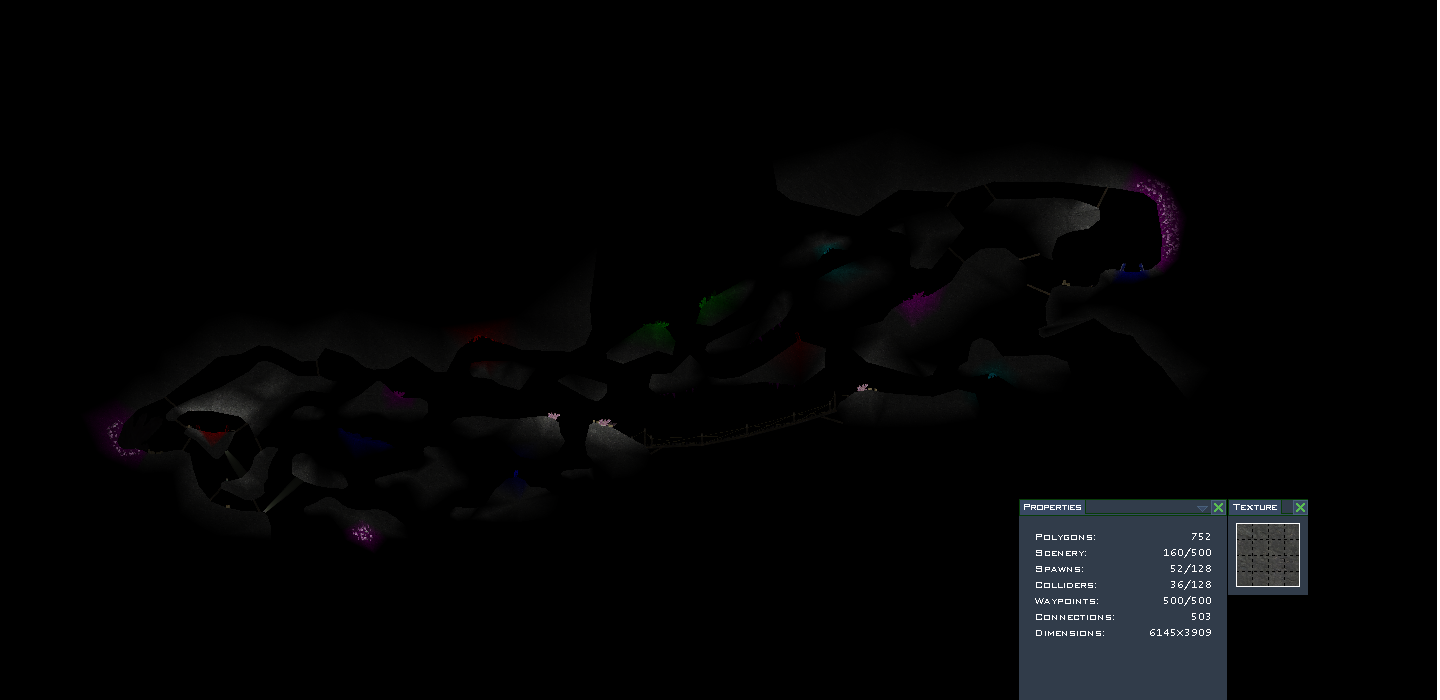 The overview is outdated and by enlarging the image you can see the current version of the map. Ctf_cavern is large, dark and pretty moody. The dark cavern is full of shadows and dark corners providing good places for campers and snipers where the fragmented layout provides a little "nuubia"-style experience. Like in the "Airpirates" -map you'd better not to fall into the darkness because it will be deadly, and this effect is strengthen with the scant jetbags. The map has working waypoints and different sides for red and blue as well as six new sceneries (crystals) that provides some light, colors and shadows in the otherwise dark environments. Fits well for team deathmatches as well as for htf.