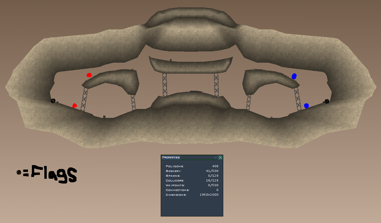 Well, since I uninstalled Soldat, I don't have any custom sceneries or textures! Well, in that case, I decided to create this map! No custom sceneries or textures :) The ONLY thing is, that I havn't tested its gameplay since I don't have Soldat installed. Feel free to do it for me :) Its a basic 3v3 CTF map =P