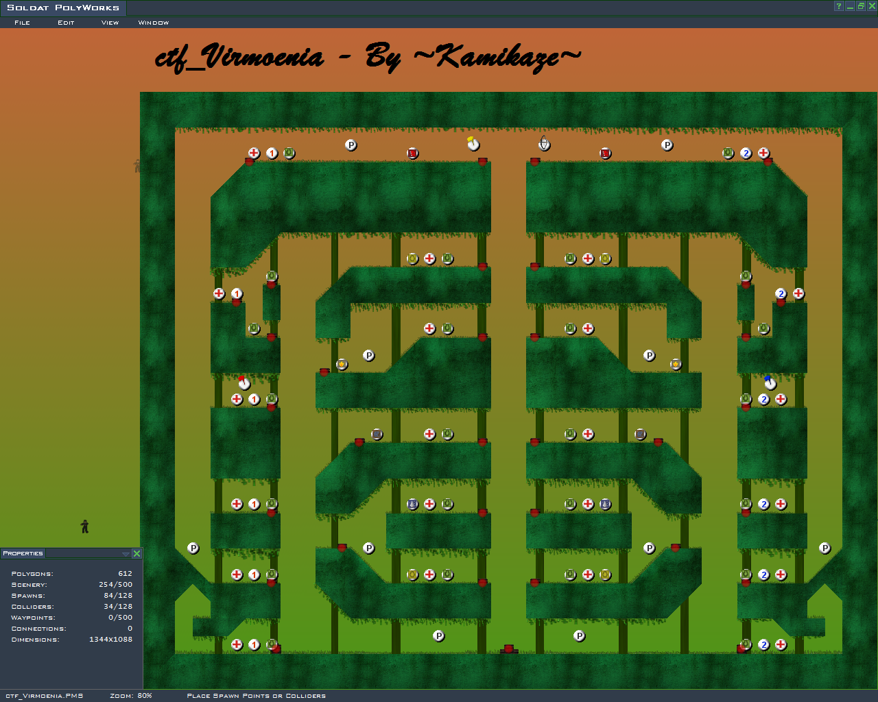 Virmoenia - By ~Kamikaze~ The name Virmoenia is a mix between the latin words Viridis -Green- and Moenia -Fortress-, since it is Green, and I got inspired by inf_Fortress. This is my first map, whatsoever. EDIT: Those of you uwho have downloaded it, re-download it cuz I forgot to "compile PMS" so you fall right throug it...Sorry