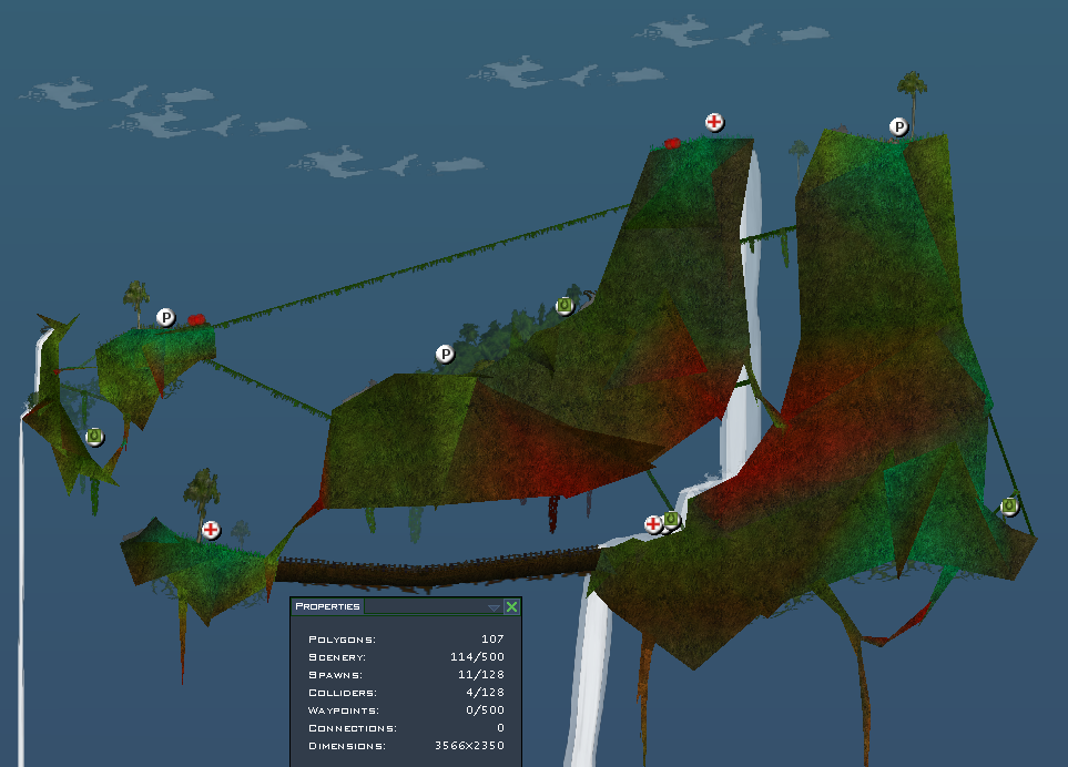 The colours are actually completely unfitting- they switch drastically from green to red, while they could do it smoothly. The layout is not ok. Using those cloud sceneries is horrid. Why can a player go over the right edge of the map and just sit on the grenade spawn- completely isolated from the gameplay?