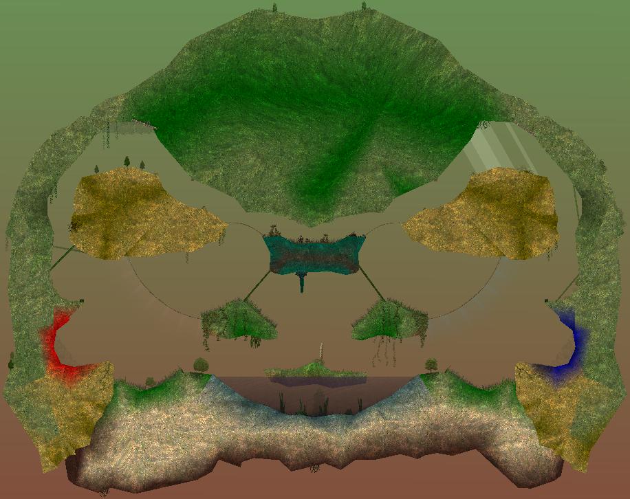 This is an almost simetrical map, were peopple usualy spawn in the top of it. The Teal island is ment to players to go directly to the other team's spawnpoint, because the flagger will be there if both teams have the flag. Players: 6-8
