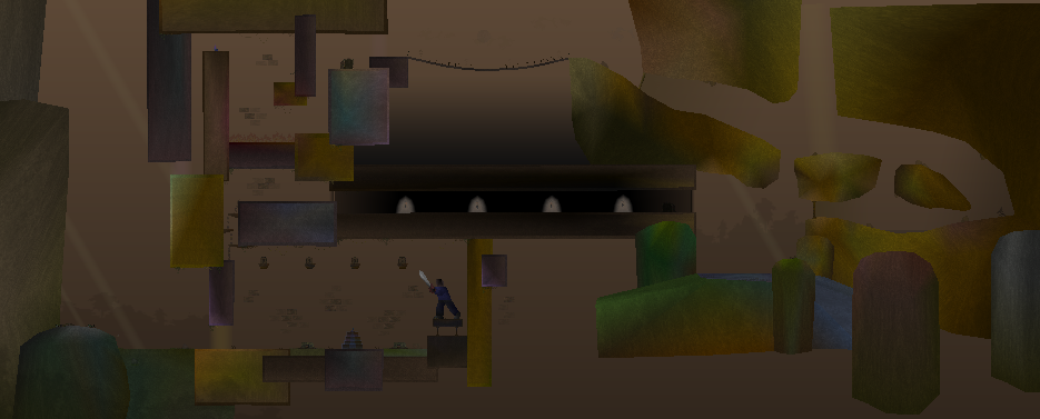 Map essentially is built around the dark tunnel concept. Temple is inspired by the Indiana Jones trilogy, especially in regard to the bridge and elements of the final room. It's pretty obvious that I gave up on making it look better -- errors in the starting point and pretty much the whole second half of the map are disappointing and rushed. Wanted to remake this as a "3-D" map since I enjoyed the map, but I never spent much time on it beyond some layout sketches and minor preparation.