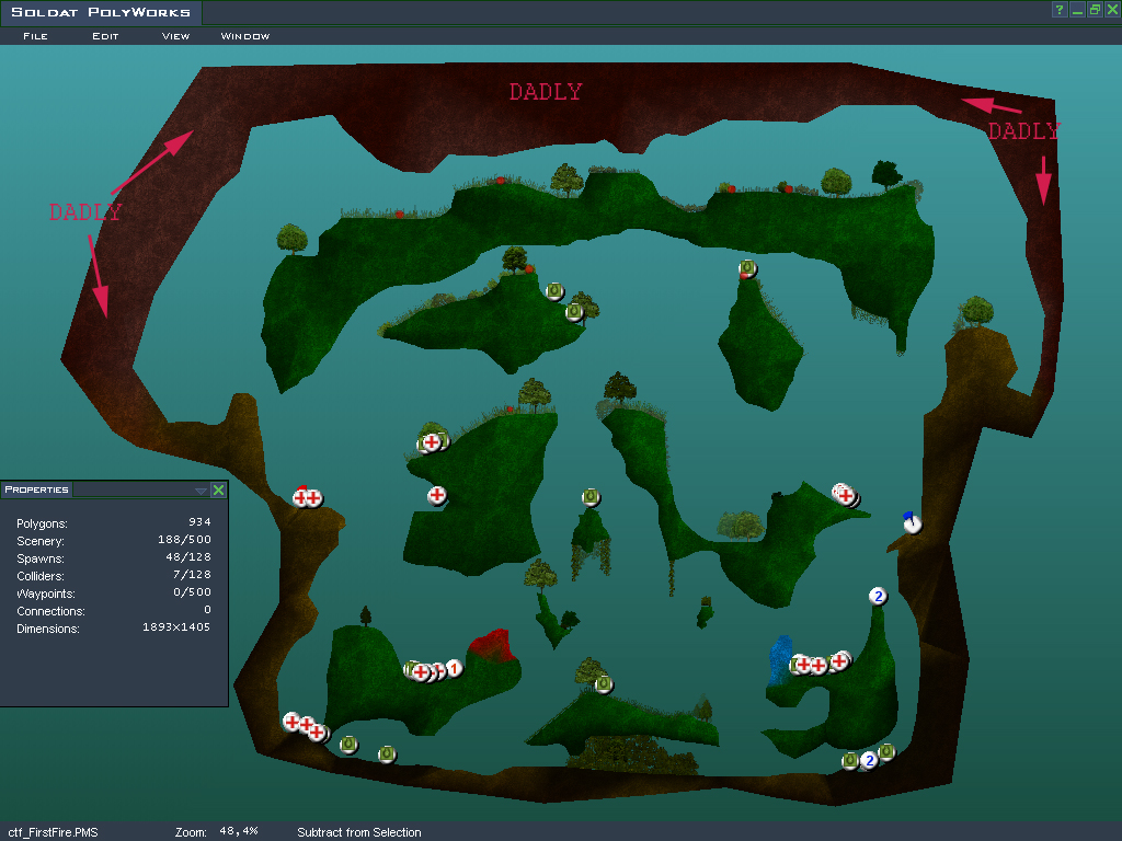 first of all, this is a good first map. When I looked at it, I thought it was a TM map, witch should be better, as you don't have any routes, it's a bunch of islands if you know what I mean. Players spawns are really ugly, and blue has advantage. But this one is shaded! yay! and the scenery is not that bad too. You could have colorised and maybe changed the opacity your scenerys, the middle ones are good, because you painted them olive, and make opacity different than 100 or 70%. You got a plus for no or few polybugs