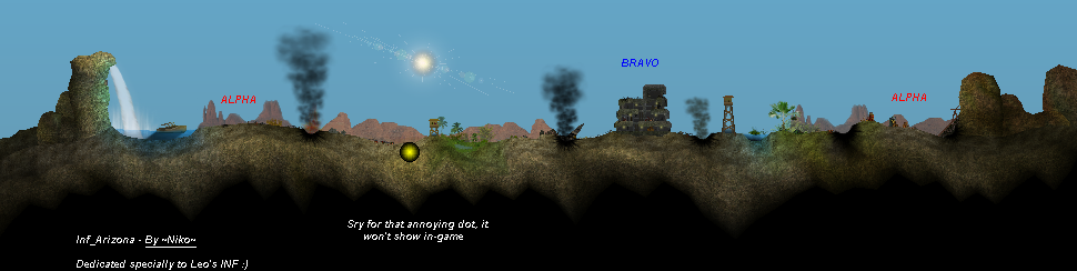 Hey hey hey! There's my new map after a long while without do any. I hope someone upload it to his INF server (I hope Leo do). I tested the gameplay a bunch of times and it's fine, you can get faster side-to-side the flow of the map. .:: The history ::. Alpha's team has arrived near the enemy bunker to backup other side teammates. They must cooperate to break the enemy's defenses and win. .:: The place ::. Desert of Arizona .:: Special thanks ::. Avarax: For his great sun. (I used it in 2 maps) Wraithlike: For his bunker of tw_Anoxi, the oasis, the turrets and the fire (A lot of thanks AND REALLY SORRY ABOUT WHAT HAPPENED) Skykanden: For give me ideas like place an oasis. (My best Soldat friend Wink)