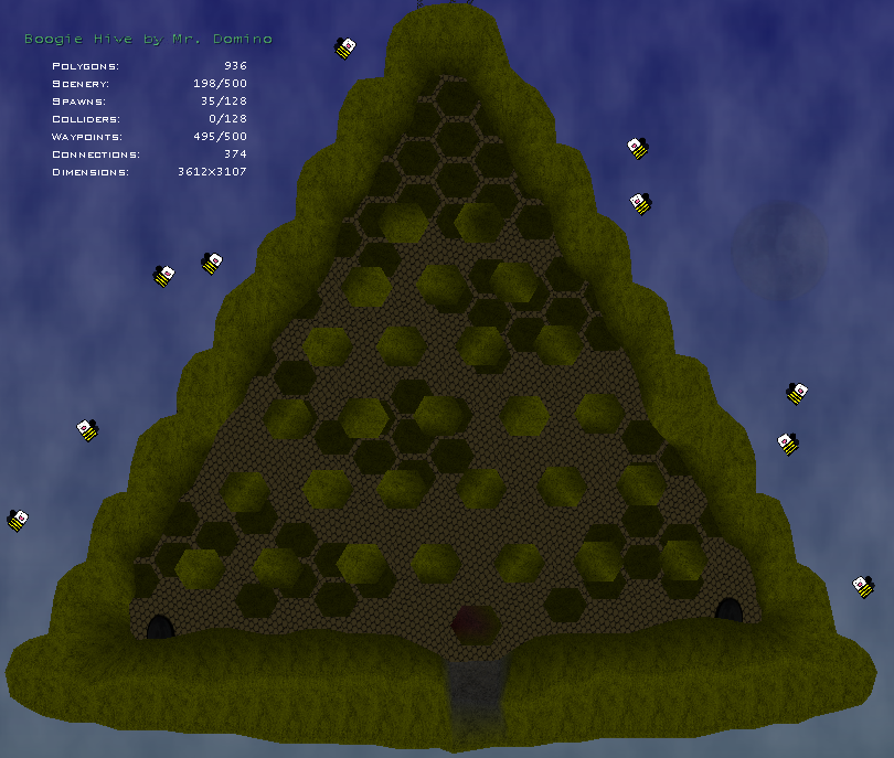 Quick little zombie map I threw together after finding that hexagon tile graphic that is the basis of the background here. It's an infinite jet zombie map with the players flying up through the maze to capture the Bravo flag as zombies rain down and drain through the pit at the bottom. The waypointing is pretty good here, though the bots will get stuck trying to score when blown off course. Unfortunately, there just aren't enough waypoints allowed by Soldat to keep that from happening.