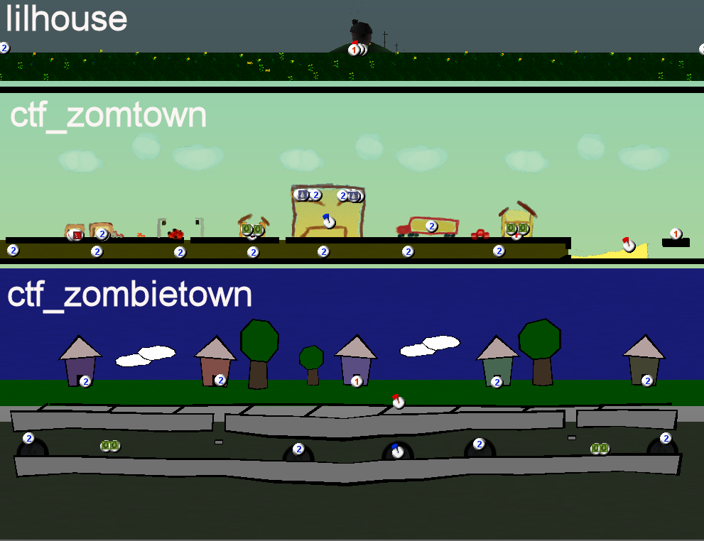 Pantsaunce made the graphics for ctf_zomtown, though he meant the bitmaps I cut up into scenery to just provide a layout concept and not the actual map graphics. The other two maps were me experimenting with a King of the Hill style zombie map (lilhouse) and a cartoon style city map inspired by the unfinished Pantsauce map (ctf_zombietown). All maps are quite unfinished tests but still somewhat playable.